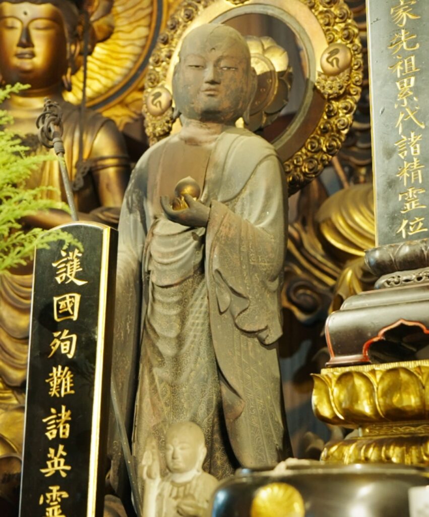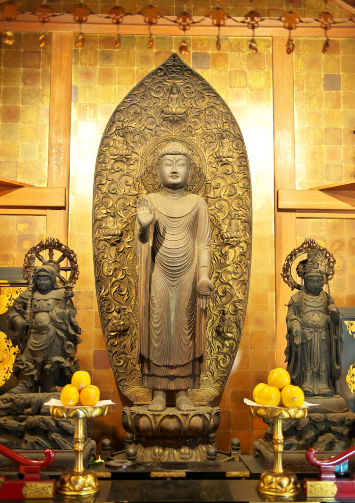 阿弥陀堂内の「来迎阿弥陀三尊像」の前にあるのが「お七地蔵」。そのお姿は西運が一万日の行を成し遂げったその夜、お七が夢枕に立って成仏した事を告げた姿を言われております。この地蔵菩薩像は身体を多少左へむけた形が特徴的です。