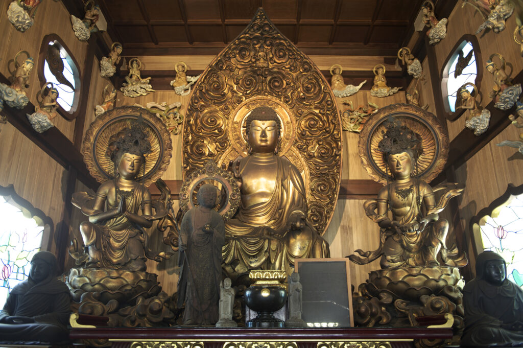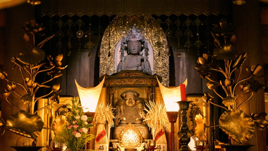 大圓寺正面、本堂には、開運出世大黒天とともに十一面観音像が安置されています。開運出世大黒天の願いの力を聞き届けるため、そのお役目として祈られております。なお観音様のご祈祷日は一月一日から三日間の修正会となります。