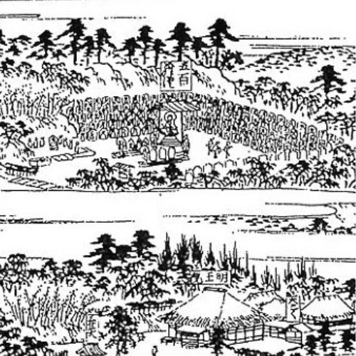 「江戸名所図会」に描かれた絵図を見ますと、前面中央に釈迦三尊と十六羅漢十大弟子像、それを取り巻くように、五百二十体ほどの羅漢像が境内一杯に並んでいます。