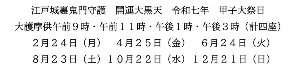 当山では開期より年六回ある暦の「きのえね」の日に大黒天の甲子(きのえね)大祭縁日が執行されております。